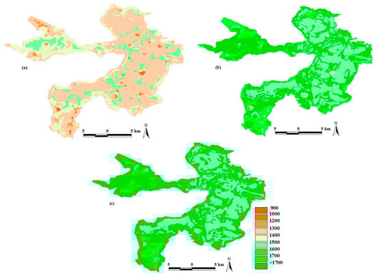 Evapotranspiration (ET) variation in Baiyangdian Lake under three different historical water levels: (a) the maximum water level (9.22 m, in 1965), (b) the water level wherein the lake dried up (6.37 m, in 1984) and (c) the maximum fractional vegetation cover (Fv) (7.15 m, in 1998).