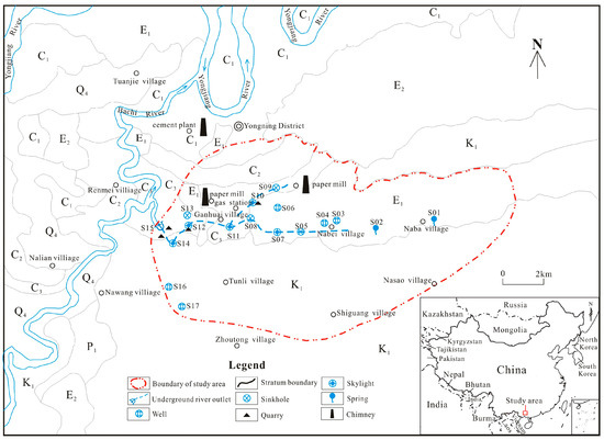 The main recharge source of groundwater in the study area is atmospheric rainfall recharge, and the recharge mode is plane infiltration recharge. Groundwater flows from east to west, and the main mode of groundwater runoff is pipeline water runoff. Groundwater is finally discharged in Qing-shui Spring Village in the form of underground river outlet (S15), and then flows into Bachi River. Groundwater depth ranges from 15–30 m. The underground river flow ranges from 0.9–3.2 m3/s, with the maximum flow in June and the minimum flow in January, which is closely related to rainfall. There are two underground river pipelines in the area, one is the main pipeline with a length of about 6.6 km (east–west trend), and the other is the branch pipeline with a length of about 1.9 km (northeast–southwest trend). The branch pipeline merges into the main pipeline at the skylight (S11) of Ganhuai Village. The underground river has become one of the main drinking water sources in Nanning, with an annual water supply capacity of 0.19 million cubic meters, mainly covering parts of Yong-Ning District and Liang-qing District, providing living water for about 270,000 people. The main pollution sources of PAHs in the basin include cement plants, paper mills, quarries and gas stations, etc.