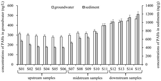 Distribution of concentrations of ∑16PAHs in groundwater and sediments.