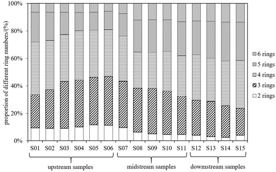 The main reason for this phenomenon was that the upstream area was far away from the city, which bears fewer pollution sources, and the underground river system itself had a certain purification ability, which reduced the concentrations of PAHs. At the same time, due to the physical and chemical properties of PAHs themselves (the 2–3 ring PAHs are hydrophilic and easily adsorbed by an aqueous medium, but the 4–6 ring PAHs are lipophilic and easily adsorbed by solid phase media), the migration modes of 2–3 ring PAHs and 4–6 ring PAHs were different, which were long-distance water phase migration and close-distance solid phase migration, respectively. Therefore, the ratio of 2–3 ring PAHs increased while that of 4–6 ring PAHs decreased.