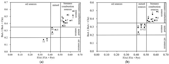 At present, many scholars at home and abroad usually use the isomer ratio method for PAHs source analysis [16,17]. The isomer ratios include Ant/(Ant + Phe), FlA/Pyr and BaA/(BaA + Chr), etc. Due to the poor stability and easy decomposition of low-molecular weight monomer PAHs (such as Ant, Phe, etc.), the isomer ratios would generate errors, which would affect the identification of the source. Therefore, the study used the ratios of FlaA/(FlA + Pyr) and BaA/(BaA + Chr) to determine the sources of PAHs in underground rivers and sediments, as shown in Table 1.