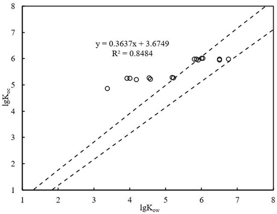 Figure 7 shows that the dotted lines are the upper and lower limits of the standardized distribution coefficient of PAHs’ particulate matter and water phase organic carbon measured under the indoor equilibrium state, which was measured by Seth (Seth et al. 1999). The upper limit equation is lgKoc = 1.08Kow − 0.41, and the lower limit equation is lgKoc = 0.99Kow − 0.81.