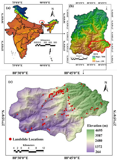 In mountainous regions, landslides are regarded as one of the reoccurring natural hazards affecting human property and lives. Landside susceptibility (LS) indicates the spatial probability of landslides in an area [1]. Landslides are often triggered by earthquakes or heavy precipitations within certain geomorphological, geological and hydrological settings. However, other primary factors controlling landslide failure mechanisms, including in situ stresses, weathering and heave, play vital roles. In mountainous regions, the effect of landslides can change the topographic characteristic, forest, soil properties (consistence, structure, density, temperature, etc.), road and farming land, depending on the magnitude of landslides [2]. Landslides in Indian Himalayas account for over 14% of the global landslides as per Froude and Petley [3] database, and one of the understudied regions is Sikkim, despite it having a huge landslide problem. Dikshit et al. [4] revealed that only 10% of landslide studies are conducted in Sikkim, of total studies across the Indian Himalayan states. The study area has witnessed destructive landslide events between 2007 and 2015 (https://data.nasa.gov/Earth-Science/Global-Landslide-Catalog/h9d8-neg4, accessed on 20 December 2020).