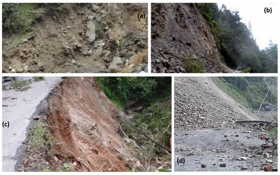 Field photographs of some selected landslide locations of the study area; (a) Gangtok Forest Block (27°22′20.07′′ N and 88°40′32.60″ E); (b) Jawarharlal Nehru Marg Road (27°22′16.77″ N and 88°40′36.21″ E); (c) Tadong area (27°18′31.60″ N and 88°36′24.91″ E); and (d) Jawarharlal Nehru Marg Road (27°21′57.71″ N and 88°39′14.47″ E).