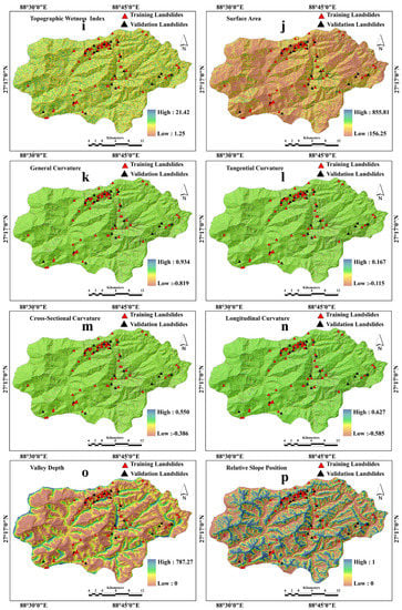 Elevation is regarded as an important factor because higher altitudes have been found to be a major cause of landslide occurrence in mountain regions [40]. The LCFs, such as slope, aspect, topographic position index, convergence index, plan curvature, terrain ruggedness index, profile curvature, general curvature, tangential curvature, topographic wetness index, longitudinal curvature, cross section curvature, surface area, VD, and RSP, were extracted from ALOS PALSAR DEM by using the SAGA GIS tool [38]. Slope is considered to be an important factor because it influences the occurrence of landslides and speed of sliding materials. The slope value in the study area varies from 0 (flat) to 80.16°, indicating an extremely steep gradient (Figure 4b) and the possibility of instability. Slope aspect (Figure 4c) indicates the direction of the slope, and has a strong relationship with landslide. It has an indirect influence because it determines the amount, duration, intensity of insolation intake, intensity of rainfall received, vegetation cover, and soil structure and texture [40]. Plan curvature is a horizontal plane and is considered the hypothetical line that crosses the contour of a given cell and regulates the stability of a landmass (Figure 4d). The surface curvature in the direction of the steepest slope is known as the profile curvature. The flow velocity of surface water, soil erosion and deposition are influenced by the profile curvature. The erosion prevails in the convex surface region, and the concave curvature is the area to be deposited [41]. The spatial distribution of the profile curvature ranges from −0.095 to 0.140 (Figure 4e). The general curvature, which was proposed by Wood [42], is defined as the total curvature that has been created by the intersection of the surface with a plan. It can be classified into three categories: convex, concave, and flat surface, corresponding to the peaks, valley, and plain areas, respectively. The spatial value of general curvature varies from −0.819 to 0.934 (Figure 4k). Wilson and Gallant [43] suggested a tangential curvature, which is curvature to a steep gradient along the orthogonal line. The value of tangential curvature in the present study ranges from −0.115 to 0.167 (Figure 4l). A similar approach of tangential curvature is found in longitudinal curvature [42]. The curvature of the line between the surface and the plane is conceptually identical and defined by the direction of slope and aspect. It can be viewed in the same way as curvature of the profile, indicating how a liquid substance is going to accelerate or decelerate over a point. The spatial distribution of the longitudinal curvature ranges from −0.585 to 0.627 (Figure 4n).