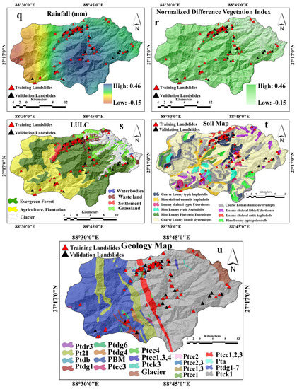 Rainfall is the triggering factor for the majority of landslides. The empirical relationship between landslides and rainfall type has been identified in many previous studies [46]. Five-year annual average rainfall data were used for the spatial mapping of rainfall by using the kriging method in GIS. The annual average rainfall is 2264 mm in this region (Figure 4q). The spatial map of geology (Figure 4u) was prepared with the digitisation process. Detailed geological descriptions are presented in Table 1. Ten soil categories were mapped for this study area (Figure 4t). Amongst them, coarse loamy humic dystrudepts associated with coarse loamy typic udorthents, and coarse loamy humicpachic dystrudepts associated with fine loamy type udorthents, are the dominant types of soil (Table 2). The LULC map was prepared by using Sentinel-2 satellite images through supervised classification determined by a maximum likelihood classification algorithm (Figure 4s). Water bodies (0.27%), wasteland (2.00%), settlement and built-up area (1.65%), grassland (5.47%), evergreen forest (47.18%), agriculture (31.92%) and plantation vegetation glacier (11.51%) are the major land use categories of the study area. The NDVI value ranges between −0.15 and 0.46 in the study area (Figure 4r) and indicates the concentration of vegetative cover. The NDVI of the study area was calculated by using Equation (5).