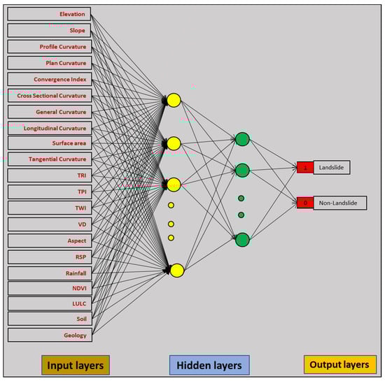 ANNs have been extensively used in classification operation [56]. The three main structures of ANN are input layers, hidden layers and output layers (Figure 6). The input layers are LCFs, the outcome layers reflect the outcomes of model predictions as a landslide or non-landslide, and the hidden layers are the classifier layers that process and convert the data from input to output. In ANN, no presumptions are required for the training datasets. Determining the relative value of the different input measures is not needed, and most input measurements are chosen on the basis of weight change during the training process [57]. ANN is constructed with two main steps [58].