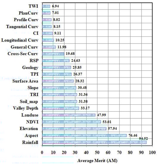 CSAE method has been used to select the most predictive factors for LSM modelling. CSAE has been used in different artificial intelligence approaches to choose a small number of training datasets, to minimise the time and cost of the modelling process [49]. In this method, zero average merit (AM) values of conditioning factors denote the significance of less contribution to modelling. On the contrary, higher than zero average merit (AM) values indicate the most important and suitable conditioning factors for LSM modelling. The CSEA is calculated by using Equation (6).