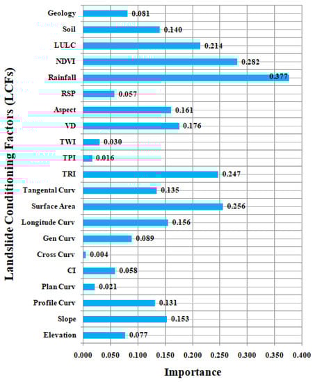where E and O are the expected and observed values. The higher the value of CSAE of a given LCF indicates greater significance for occurrences of landslides [43].