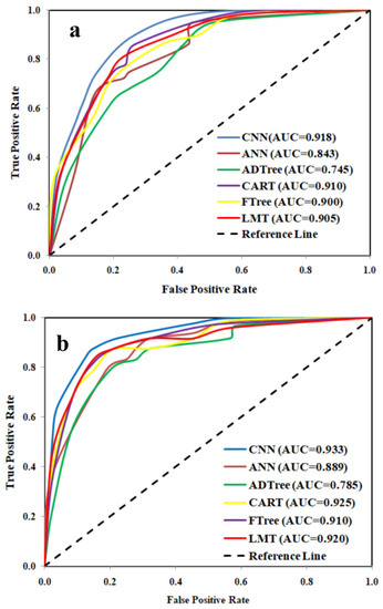 LSMs produced using CNN, ANN, CART, ADTree, FTree and LMT models were evaluated through 21 statistical measures mentioned in Table 3. The ROC curve is constructed with the true positive rate (TPR) versus the false positive rate (FPR). The TPR consists of landslide cells, which indicate the most susceptibility. The FPR consists of non-landslide cells, which indicate the non-susceptibility. If the area under the ROC curve remains extremely close to 100%, then the model reflects higher goodness-of-fit and excellent accuracy [66]. The AUC is indicative of the consistency of a calculated model [67]. The ROC curve consists of four elements, being, true positive (A), false positive (B), true negative (C) and false negative (D) [68] (Equations (17) and (18)).