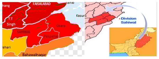 23]. Due to its efficacy in data use, it is also known as the minimum data approach, as it utilizes secondary data sets for generalizations. The Sahiwal division map is shown in