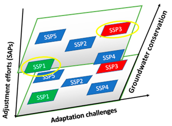 Figure 3 below. The shared socioeconomic pathways 1 and 3 are linked with a sustainable development pathway under low and high growth, which are linked with biophysical and socioeconomic indicators. This study develops sustainable development pathways with moderate growth, considering resource depletion and farmer sensitization regarding water conservation and management practices. The shared socioeconomic pathways are determined via the interrelationships of adaptations and conservation practices regarding groundwater in compliance with efforts towards sustainable practices. Shared socioeconomic pathways could be sustainable or unsustainable, with high or low development pathways, and are linked with representative concentration pathways. This study utilized sustainable development pathways and moderate development.