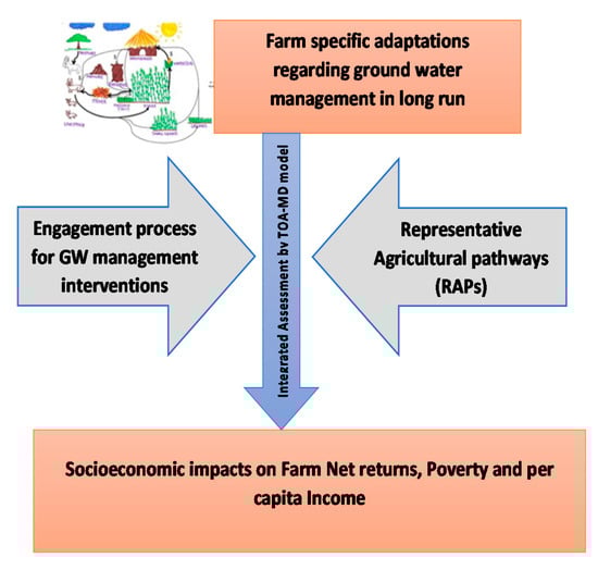 This study is based on a comprehensive engagement process with researchers, policymakers and farmers, investigating the adaptations made at the farm level regarding ground water in order to enhance the sustainable agricultural pathways. The engagement process formulates future agricultural pathways and the economic viability of the proposed adaptations. The interventions impact farm returns, poverty and per capita income under sustainable resource utilization. The adoption of the proposed adaptations and management practices is also evaluated considering economic viability via a cost–benefit analysis. There are very few economic models that can be utilized specifically for policy evaluations. The socioeconomic viability of the recommendations is relevant to the impact of the research and interventions, as the economic rationality influences decisions about the adoption or non-adoption of the proposed adaptations at the farm level [