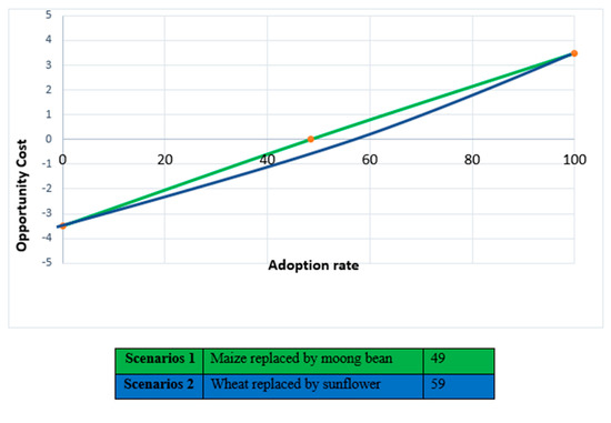 Figure 6 describes the possible development pathways and adaptation options in the future. This study adopts the sustainable development pathways as projected by the green pathway, and the increases in farm incomes resulting from the adoption of management interventions are shown. The adoption rate for proposed interventions is estimated via the opportunity cost of adoption and non-adoption. The difference between net returns from system 1 and system 2 defines the opportunity cost.