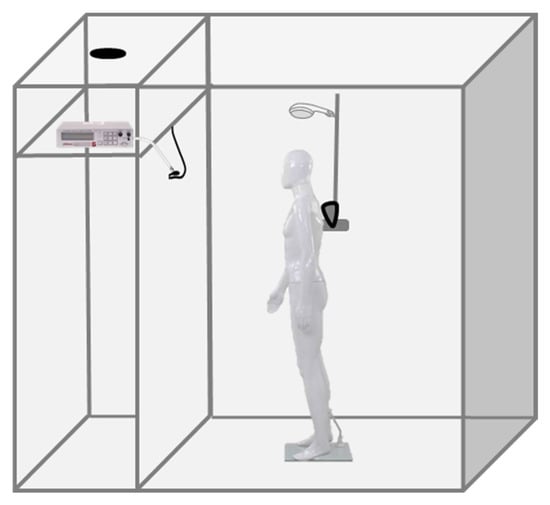 The shower stall—of maximum dimensions 2.1 m long × 1.5 m wide × 2.5 m high—was equipped with a mechanical extraction ventilation system and connected to a drinking water supply system, and to the building’s water-heating system. The hardness of the water ranged between 1.8 and 2.0 mmol/L CaCO3. The front opening was fully closed with an acrylic door. To protect the air monitoring instruments from splashing and to maintain the air moisture low enough for their proper functioning (i.e., below 80%), a 1 m × 2 m Plexiglas separator with a nose-shaped opening was built between the bathroom extraction fan and the shower arm, reducing the experimental shower stall volume to 5.6 m3 (1.5 m × 1.5 m × 2.5 m). A regular mannequin (1.7 m high) could be placed within (Figure 1). The water was aimed at the top of its head from a distance of 0.2 m.