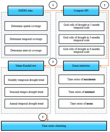 This study follows an integrated framework including the three main steps presented in Figure 1. In the first step, we created an automatic program to retrieve precipitation data from IMERG (retrieved from https://gpm.nasa.gov/, accessed date: 5 May 2021). The program requires determining the spatial coverages or areas of interest and the range of temporal interest or duration of data. It also requires a temporal interval step for data retrieval. In the second step, we computed the SPI for meteorological drought estimation. The last step is to extract the characteristics of drought corresponding to each eco-watershed of the Mekong River, using zonal statistics with drought properties determined by the run theory. After that, we estimated drought characteristics and drought trends to get the comprehensive drought properties by applying the Mann–Kendall test. In these steps, the extreme droughts based on time series clustering and the monthly drought trends detected by the Mann–Kendall test are the most important results.