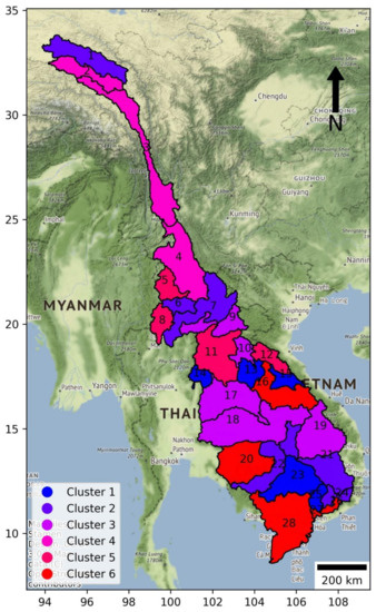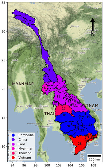 The study area was divided into 28 zones as ecology catchments and colored by the six MKB countries, following Gassert et al. [23]. We numbered zones following the latitude, identified from 1 to 28. Detailed zonal characteristics are described in Figure 2 and Table 1.