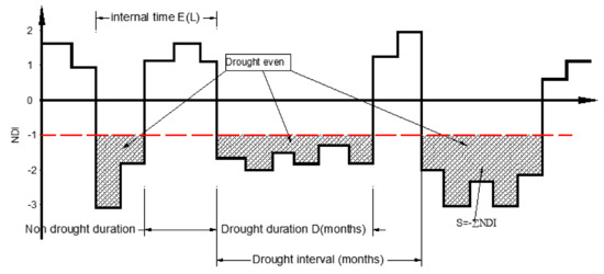 Drought events and drought characteristics are determined using the run theory [27], presented in Figure 3. Drought events begin when the SPI value is lower than the threshold (−1 means moderate drought, and −2 means extreme drought) and continue until it is higher than the threshold. Drought severity (DS) is defined by the total value of the SPI [28]. Drought duration (DD) is defined by the number of months in the event [29]. Drought interval is the time between the beginning of a drought event and the beginning of the next drought event [30].