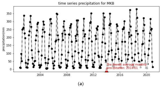 Based on the precipitation data retrieved from IMERG, we determined spatial distribution for precipitation in the MKB from 2001 to 2020 (Figure 4). Overall, the IMERG data performed well for the precipitation characteristics of the MKB, which were found to be similar compared with those from study [34]. The average monthly precipitation fluctuates in a range of lower than 10 mm to over 350 mm. Of those, the precipitation event in November 2014 had the lowest precipitation over the period, with the average monthly precipitation at 2.97 mm (Figure 4). The results also show that rainfall increases from January to August and decrease gradually from August to December. The most rainfall is in summer (JJA) and autumn (SON). Meanwhile, winter (DJF) and spring (MAM) rainfall are lower.