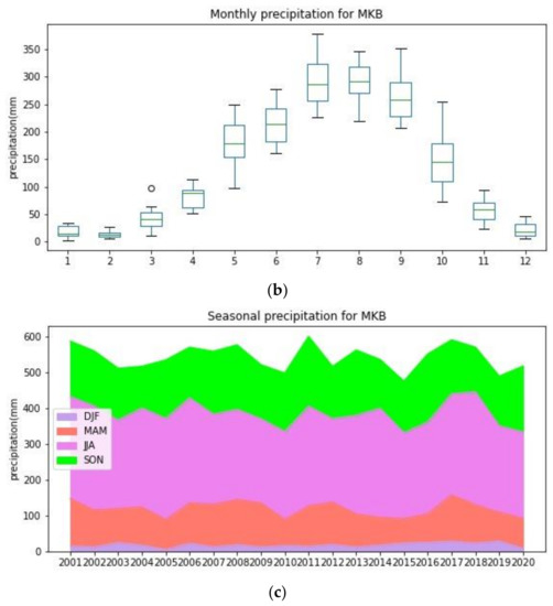The lowest average monthly precipitation (a), monthly (b), and seasonal (c) precipitation of the MKB with DJF (December, January, February), MAM (March, April, May), JJA (June, July, August), and SON (September, October, November).
