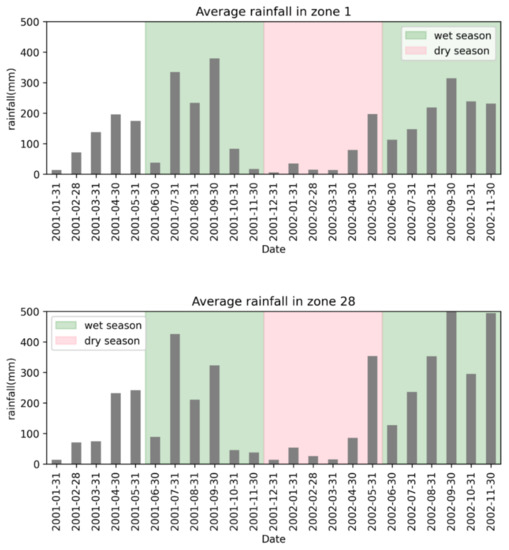 Average rainfall distribution in Zone 1 and Zone 28.