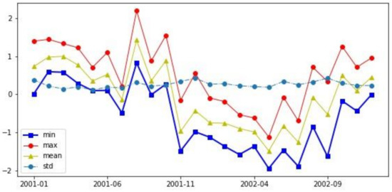 To evaluate the spatial distribution of drought, we calculated the SPI index for the entire region before analyzing the max, min, mean, and standard derivation (std) values at each zone. Figure 6 shows the results of zonal statistical analysis in 2001–2002 with an example for Zone 1. Various raster pixel values of SPI in the same zone were compared using a zonal statistical model. Except for the std value, the max, min, and mean values tend to fluctuate quite similarly in Zone 1. Therefore, we chose the min value, because it is the one that causes the most extensive drought and poses the riskiest situation.