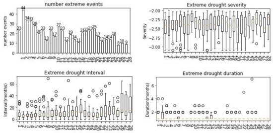 We computed the SPI to explore extreme drought severity events in the MKB. The analysis of historic drought determined that drought phenomena are complicated in the study area. The analysis results determined the spatial distribution and the dry time for the entire basin. The results show the differences in each zone’s drought characteristics, including the number of droughts that occurred, the duration, the severity, and the time interval between two consecutive droughts. According to the run theory, Zone 2 has the most frequent drought events (44 extreme drought events). Zone 26 has a minor drought, with eight extreme drought events (Figure 7). The circles in Figure 7’s graphs are the outliers that mainly occur when the drought duration in the region is more complex and unpredictable than the normal drought level. However, Zone 24 has the highest average drought duration of 7 months, while severe extreme droughts occurred under two months. The interval drought events, or the time between two drought events, indicate that the average interval of extreme drought is around ten months in the MKB.