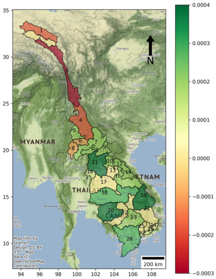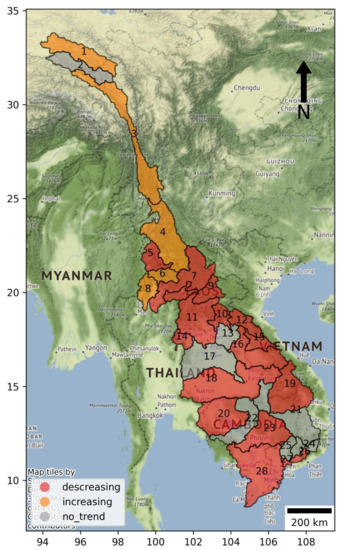 The Mann–Kendall test shows that the upper part of the MKB (Zones 1, 3, 4, 6, and 8) has increasing drought trends (Figure 8), while the lower part (Zones 5, 7, 9, 10–12, 14–16, 18–20, 23, 26, 27, and 28) has decreasing drought trends. The remaining zones have no significant drought trends, including the Mekong Delta in Cambodia and Vietnam.