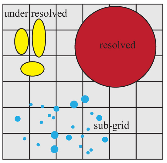 Nevertheless, numerical modeling of cavitation flow is challenging due to the polydispersity of cavitation bubbles which ranges from dilute to dense. In general, gas-liquid interfaces can be classified into fully solved (resolved), under-resolved, and sub-grid interfaces with respect to grid size. A schematic of three different interface types is given in Figure 1. Various of numerical methods, such as those in References [9,21], have been developed to model the resolved and under-resolved interfaces. In this work, the sub-grid bubble-fluid interface is mainly considered, and the Lagrangian-Eulerian (LE) coupling model is adopted.