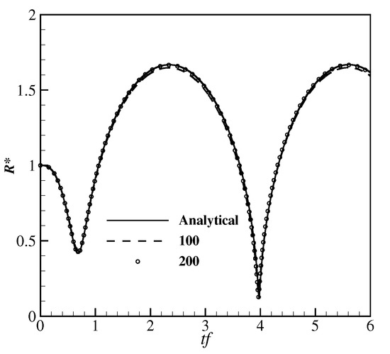 Following References [20,39], a single gas bubble inside water excited by a pressure wave towards the bubble center, where an analytical solution is available for rigorous comparison, is simulated to validate the present method. The pressure wave follows