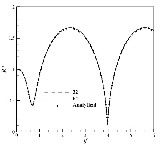 In the 3D test, the domain size is 20 mm × 10 mm × 10 mm with two resolutions ([64 × 32 × 32] and [32 × 16 × 16]). A spherical bubble with identical initial condition is placed at the center of the computational domain. The time evolution of the dimensionless parameter for two different meshes and the analytical solution are shown in Figure 3. Compared to the results in Reference [20], which used the resolution of [100 × 50 × 50], the time history of the bubble radius is obtained accurately by the present model with a coarse resolution of [64 × 32 × 32]. Since the present model adopts the isobaric closure and the modified RP equation, it can calculate the pressure and density field surrounding the bubbles with sufficient accuracy, even with a coarse resolution.