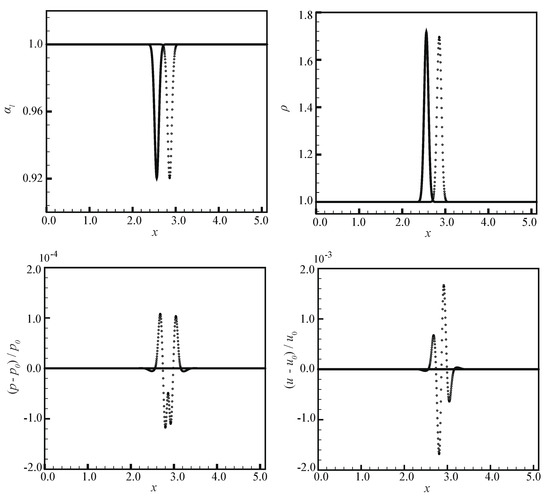 When a gas bubble streams with the same speed as the carrier fluid under no-slip motion, the exact solution to this problem is the advection of the volume fraction and mixture density under a constant speed. The numerical model should also preserve the constant pressure and velocity profile along the streamline well. In the dispersed Lagrangian model, the advected interface leads an inconsistency between the volume fraction and the mixture pressure p because the volume fraction is evaluated directly from the bubbles’ sizes and locations. Indeed, the numerical oscillation induced from this inconsistency cannot be removed completely.