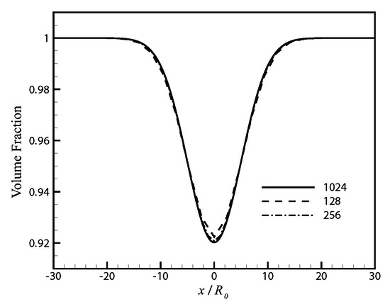 The bubble oscillates actively as , where is the perturbation magnitude, and is the frequency. We set , , and . The 1D dimension length is . The bubble is initially located at the center of the domain. The width of the support in the Gaussian kernel is initialized as . Figure 5 presents the volume fraction along the radial axial under three different resolutions, i.e., 128, 256, and 1024. The resolution of 1024 is used for the further simulations.
