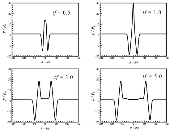 The bubble oscillates actively only for a half period ; afterwards, the volume of the bubble returns to its initial radius and remains still. In Figure 6, the pressure wave along the radius axis at are given. The bulk fluid is expanded, at first, and then compressed due to the variation of the bubble. As a result, a first-negative and second-positive pressure wave propagating along the radius axis presents. Figure 7 gives the pressure waves along the radius axis at of the second case, in which the bubble oscillates continuously without pause. It can be observed that the amplitude and frequency of the continuous pressure waves induced by the bubble oscillation are also well resolved.