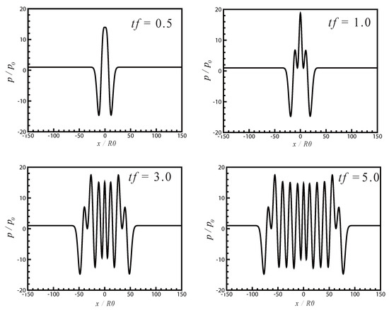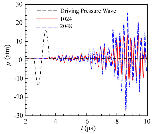 As shown in Figure 9, the pressure pulse inside the bulk fluid induces the bubbles’ vibration. In turn, the vibration of the gas bubbles induces the pressure disturbance in the bulk fluid. The evolution of the pressure p at the cloud’s center is reported in Figure 10. This results correspond to two different resolutions on x-axis. The driving pressure wave propagation in the liquid without the bubble cloud is also plotted. With a higher resolution of 2048 in x-axis, the amplitude of the pressure wave is increased. Note that the frequency of the pressure wave has already been resolved well with a resolution of 1024. Due to bubbles’ oscillation and bubble-bubble interactions, the pressure at the cloud center can reach an amplitude of 30 atm.