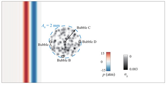 Figure 8 shows the bubble cloud with a radius of containing 200 gas bubbles with a random radius distribution between and . The scattered black tiny points represent the bubbles, and the gas fraction , which ranges from to , colored by a gray scale contour, is used to visualize the bubbles distribution. The sinusoidal pressure wave moving from left to right is initialized by using , with a wave length of and amplitude of atm and the pressure at infinity . The negative pressure reaches the bubble cloud first, inducing the bubbles to expand. The initial velocity field is set to zero. The computational domain is (L = 10.24 mm), and the finest resolution is . The kernel width for each gas bubble is initialized as dx, with dx denoting the finest grid size. Four bubbles, i.e., Bubble A (on the left side), Bubble B (on the bottom), Bubble C (at bubble cloud center), and Bubble D (on the right side), are marked. They are used to analyze the influence of the pressure wave on the bubbles at different locations in the cloud.