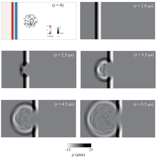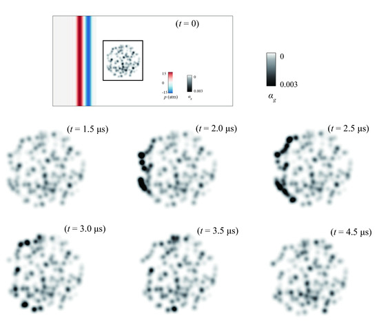 At t = 0, the center of the bubble cloud is at (, ), and the center of the pressure wave is at = 0.34. Then, the pressure wave propagates from left to right and interacts with the bubble cluster. The pressure fields at , , , , and are shown in Figure 9. It can be observed that the pressure wave reaches the bubble cluster boundary and is reflected by the cloud boundary. When the fluid has a low gas volume fraction, the shape of the pressure wave is almost unaffected [20]. In our results, the pressure wave is partially reflected, and the rest of the wave travels through the cluster. The bubbles vibrate when the pressure arrives, while remaining in equilibrium with the bulk fluid before the pressure wave.