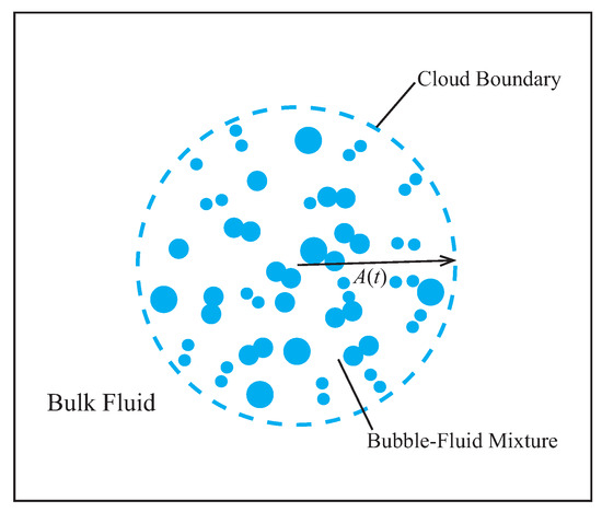In classic RP equation as Equation (4), the radius R of a spherical bubble is defined by the pressure inside bubble and the infinity flow properties, i.e., and . However, defining the reference p and of the surrounding liquid at infinity as and to model bubble cloud dynamics other than a single bubble is not suitable. To obtain and in Equation (4) for a bubble cloud, we define the fluid surrounding each bubble inside a limited volume as fluid mixture. The volume should enclose the bubble and be larger than the kernel support area [20]. According to numerical tests, we suggest as the radius and the volume is marked by . For bubble i, and have the following explicit expressions: