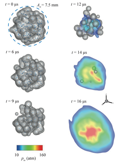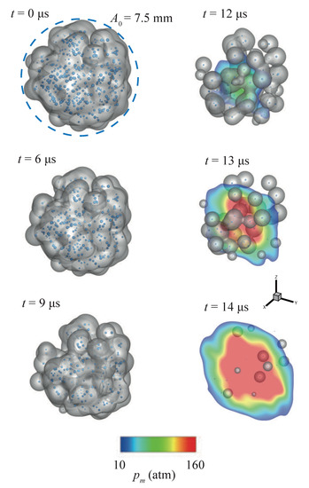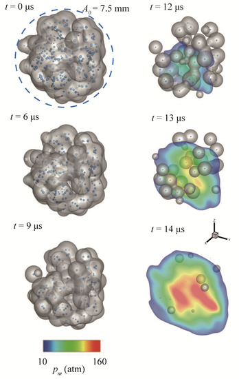 During the collapse, extremely high pressures are generated from the center of the bubble cloud. In Figure 14, the slices of the higher pressure region, where the pressure is greater than 10 atm, are presented at each time instant. The higher pressure increases over time. At the end of the collapse process, the extreme pressure reaches its maximum value around 174 atm when the collapse rate reaches its maximum value. In Figure 15, revolutions of the dimensionless active bubble number and the dimensionless averaged gas fraction () are reported. The vapor clouds collapse completely at about t = 14.5 s.