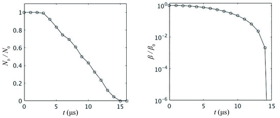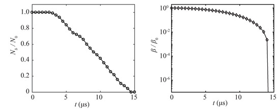 With the given pressure and velocity data from Eulerian grids, behaviors of the cavitation bubbles can be studied by solving the modified RP equation in Equation (4). One difficulty in solving RP equation is the successful presenting of the collapse and rebound stages, even when a bubble has the minimum size and the change rate of R is extremely large. When bubble radius R becomes incorrect, negative, or unstable, the computation of the volume fraction may fail in Eulerian frame. To address this difficulty, the variable time-step numerical algorithm [37] is adopted. In this algorithm, the time-step size of the Lagrangian computation corresponds to the radio of the bubble size. We define the time-step size for each bubble as . Following Reference [37], a criterion is applied to ensure that the rate of is numerically controllable in each time step, which gives: