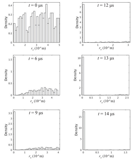 The bubble distributions (radii density bar graphs) of the bubbles’ radii at t = 0 s, 6 s, 9 s, 12 s, 13 s, and 14 s. The first bar from the left side indicates the density of the collapsed vapor bubbles.