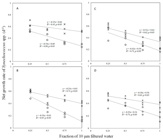 Dilution plots of Synechococcus spp. net growth rate (day−1) versus the fraction of 10 μm filtered water in early (A), the end of July (B), August (C), and September (D). Open circles and cross marks represent the net growth rates in the in situ condition and nutrient-enriched treatments, respectively.