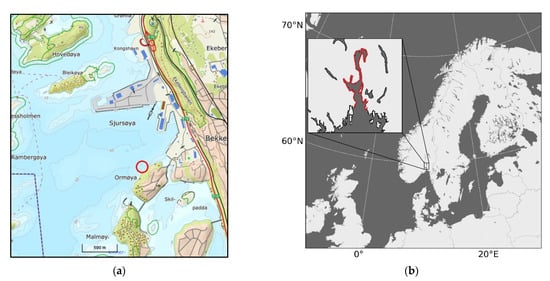 Location of the Oslofjord on the map (a) and the position of the treatment plant in the Bekkelaget basin of the Oslofjord (b). The discharge point for the Bekkelaget WWTP at 50 m deep is marked by red ring.