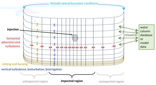 This work is based on a combination of 2-Dimensional benthic-pelagic transport model 2DBP, biogeochemical model OxyDep and MP transformation model BioPlast. These modules are integrated into an existing modular platform (Framework for Aquatic Biogeochemical Modeling, FABM; []), and is therefore coded as a set of reusable components.