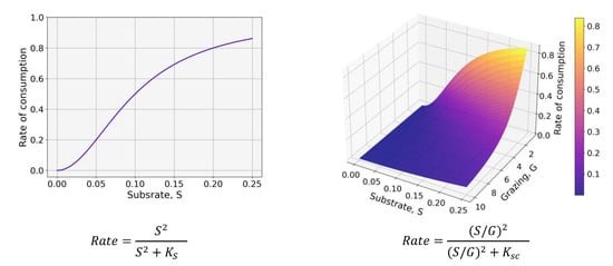 Dependences of rate of consumption on concentration of Substrate S (left) and availability of substrate as ratio between substrate and Grazer, G (right).