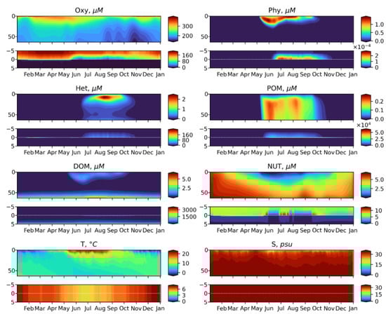 The simulated ranges of changes of dissolved oxygen, nitrate and nitrite, and phytoplankton correspond to the available observations data (Figure 6). Concentration of modeled PHY of 1 µM N corresponds to 3.78 µg Chl-a/l. The modeled HET maximum of 2 µM N would correspond to 2800 mg WW/m3, assuming a nitrogen content of 1% of the wet weight zooplankton biomass [].