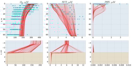 Modelled seasonal changes of the vertical distributions of dissolved oxygen (O2, µM), nitrate and nitrite (NUT, µM N), and phytoplankton (PHY, µM N) shown as red lines and results of observations from WOA18 database [] shown as blue circles. The top row—water column, the bottom row—bottom layer and sediments.
