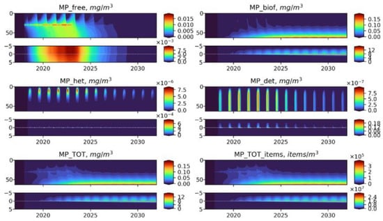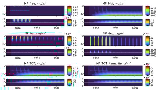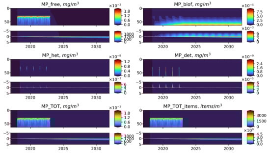 Neutrally buoyant MPs are distributed over the entire water column, reaching the maximum concentration at the discharge point. Such a uniform distribution can be explained by the fact that the model does not adequately reproduce the effect of stratification. This is further discussed in the Model Limitations section. In a summer, MP is exposed to biofouling in the upper layers and then accumulates in the biofouled form in the bottom layer and on the bottom surface. At the end of the MP discharge period makes up the greatest part of total MP. The similar pattern exhibits floating MP, apart from the fact that its free form concentrates in the surface layer, where it is intensively biofouled during phytoplankton blooms. MP of negative buoyancy tend to behave in a completely different way It starts to sink immediately and quickly reaches the bottom so that the biota does not have time to affect it in the water column at least to some extent, and most of MPs accumulates in the sediments in a virgin form. Only during the bloom period, a small share of the heavy MP can be biofouled or injected in the water column (Figure 12), but its fraction is about six orders of magnitude lower than that of the floating or neutral buoyancy MP.
