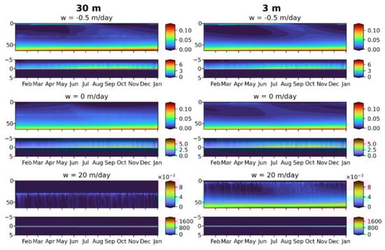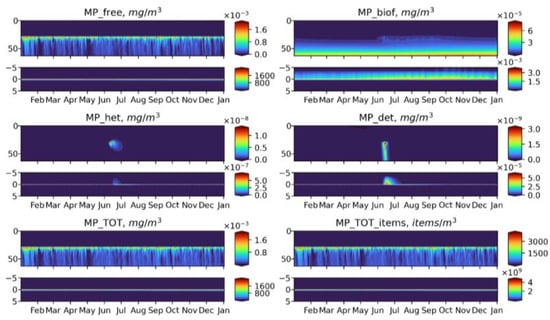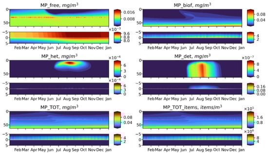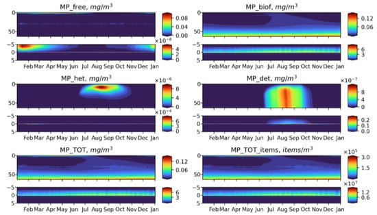 Figure 14 summarizes the model findings for the MPs particles initially released as the floating, neutral and sinking ones. We show the seasonal variability of (that corresponds to MP detected during the observations) in the case of release at 30 m depth (left column), discussed above and at 3 m depth. Change of the release point from 30 m to 3 m doesn’t affect qualitatively the features of seasonal variability of the floating and neutral MPs, but for the denser MPs the differences arise. In case of a release at 30 m (below the pycnocline), heavy MP sinks down rapidly and cannot be captured and significantly slowed by biota and organic matter, but in case of a release at 3 m depth it can be partially trapped in the surface layer during the production period that can be explained by density decrease of the sinking MP and by intensive turbulence in the upper mixed layer. That account for numerous observations of high dense MPs in a water column during the field studies []. For the floating MPs, the shift of the discharge from below the pycnocline to the upper mixed layer led to a less pronounced effect of the summer “purification” of the surface layer from MPs, and the same held true for the neutrally buoyant MPs.