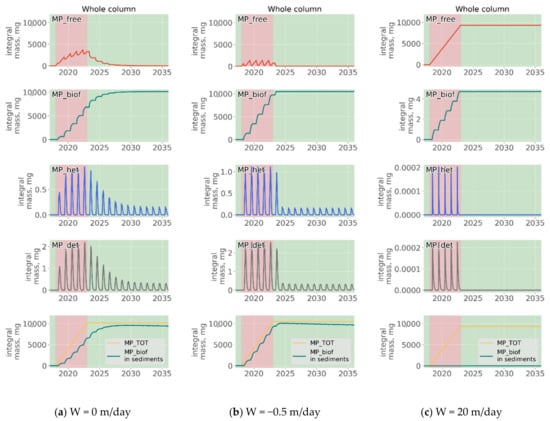 Long-term dynamics of different forms of MP integrated over the model domain in the numerical experiments for neutrally, positively and negatively buoyant particles demonstrates that the total amount of MP is conservative (Figure 13).